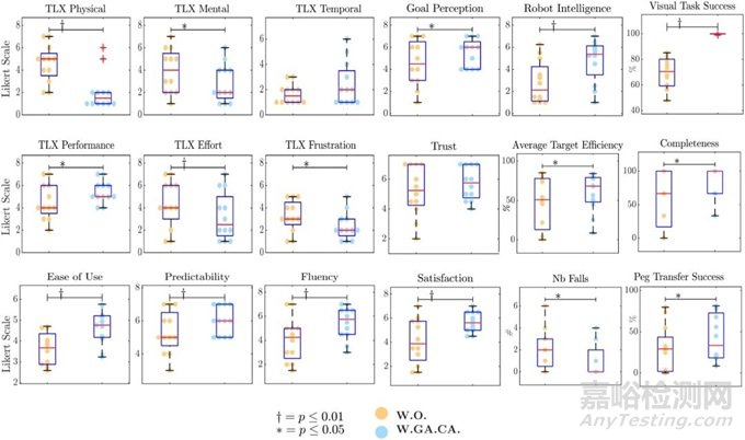 主要結(jié)果如下:1)共享控制對(duì)四手任務(wù)中的作用(如圖3所示)。聯(lián)合使用抓取和視覺(jué)輔助顯著改善了絕大多數(shù)客觀指標(biāo),包括平均目標(biāo)效率和任務(wù)完成度顯著提升,失敗次數(shù)顯著下降;在四手任務(wù)中視覺(jué)任務(wù)和工作操作任務(wù)的成功率同樣顯著提升。在主觀指標(biāo)中也獲得了類似的影響,在任務(wù)負(fù)荷方面,使用這兩種輔助模式顯著改善了定位和抓取動(dòng)作的心理需求、努力、挫折和表現(xiàn)。在使用感知方面還顯著提高了流暢度指數(shù)。