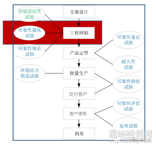 答:高加速壽命試驗(yàn)時(shí)機(jī)一般是在工程研制階段早期進(jìn)行,且越早開展越好,不同試驗(yàn)開展時(shí)機(jī)如下圖所示。另外,高加速壽命試驗(yàn)應(yīng)力的確定方法一般有三種:一是通過開展失效模式與影響分析 (FMEA)、故障樹(FTA);二是現(xiàn)場使用反饋信息 ;三是參考開展過 RET的相似產(chǎn)品。企業(yè)也要依據(jù)歷史經(jīng)驗(yàn)和產(chǎn)品實(shí)際情況改進(jìn)方案,選擇到適用于該產(chǎn)品的最有效的應(yīng)力類型。