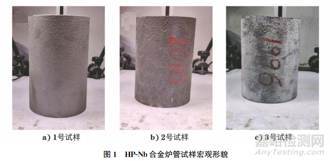 選用不同服役年限的天然氣制甲醇的轉(zhuǎn)化爐輻射段爐管進(jìn)行分析。從規(guī)格為114mm×12.5mm(外徑×壁厚)的制甲醇轉(zhuǎn)化爐爐管中截取試樣(見(jiàn)圖1),高溫爐管服役時(shí)的外壁溫度為985℃,壓力為2.6MPa。試樣材料為HP-Nb合金,選取的3組試樣分別為:1號(hào)新管試樣、2號(hào)服役11a爐管試樣、3號(hào)服役25a爐管試樣。
