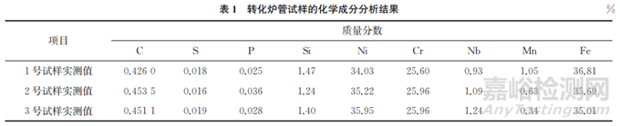 采用熒光光譜儀和碳硫分析儀對(duì)所取試樣進(jìn)行化學(xué)成分分析,結(jié)果如表1所示,合金成分均滿足HP-Nb合金的技術(shù)要求。