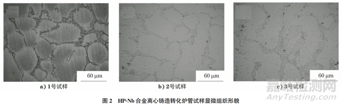 Fe-Cr-Ni合金離心鑄造轉(zhuǎn)化爐管的顯微組織為奧氏體基體+骨架狀共晶碳化物,共晶碳化物在晶界呈片狀、層狀分布于奧氏體基體上。圖2為 HP-Nb合金離心鑄造轉(zhuǎn)化爐管試樣的顯微組織形貌。圖2a)為1號(hào)試樣的顯微組織形貌,為轉(zhuǎn)化爐管顯微組織的初始狀態(tài),圖2b)、2c)為2,3號(hào)試樣的顯微組織形貌。由圖2可知:1號(hào)試樣中片層狀碳化物分布在晶界上,形成了不完全連續(xù)的骨架狀,晶內(nèi)無(wú)二次碳化物析出;在2號(hào)試樣的奧氏體晶粒內(nèi)部析出了大量彌散的二次碳化物,析出的二次碳化物呈細(xì)小球狀和棒狀,與鑄造未服役的新管相比,晶內(nèi)析出了大量細(xì)小的二次碳化物,同時(shí)晶界的片層狀共晶碳化物發(fā)生粗化,形成了連續(xù)的鏈狀、網(wǎng)狀碳化物;3號(hào)試樣的共晶碳化物進(jìn)一步粗化,形成連續(xù)粗大的網(wǎng)狀結(jié)構(gòu),晶界碳化物的片層狀結(jié)構(gòu)完全消失,形成了連續(xù)的網(wǎng)狀碳化物,晶內(nèi)的二次碳化物數(shù)量減少,聚集長(zhǎng)大成粗大的塊狀,二次碳化物的聚合長(zhǎng)大是合金顯微組織進(jìn)一步劣化的表現(xiàn),導(dǎo)致轉(zhuǎn)化爐管的力學(xué)性能進(jìn)一步降低。