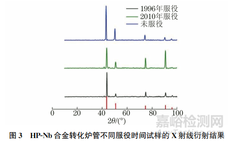 圖3為HP-Nb合金轉(zhuǎn)化爐管不同服役時(shí)間試樣的X射線衍射(XRD)結(jié)果,試樣主要的物相為奧氏體基體,圖中紅線為奧氏體XRD標(biāo)準(zhǔn)峰,奧氏體對(duì)應(yīng)的衍射峰突出。服役后的爐管奧氏體衍射峰仍非常強(qiáng),服役前后XRD結(jié)果的區(qū)別在于多了一些強(qiáng)度較小的衍射峰。對(duì)比分析服役前后的試樣,服役后試樣比服役前試樣多出的強(qiáng)度較小的衍射峰應(yīng)為服役后析出的二次碳化物的衍射峰。離心鑄造新管中的一次碳化物為亞穩(wěn)態(tài)的M7C3型碳化物。在長(zhǎng)時(shí)間高溫服役后,離心鑄造轉(zhuǎn)化爐管中的M7C3型碳化物轉(zhuǎn)化為更為穩(wěn)定的M23C6型碳化物。同時(shí),長(zhǎng)期服役后析出的二次碳化物也為M23C6型碳化物。