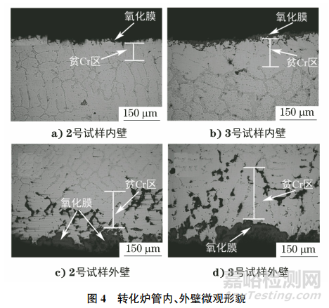 轉(zhuǎn)化爐管內(nèi)、外壁微觀形貌如圖4所示,由圖4可知:服役后轉(zhuǎn)化爐管內(nèi)、外壁均生成了氧化膜,氧化膜厚度與服役時(shí)間有關(guān),服役時(shí)間越長(zhǎng),轉(zhuǎn)化爐管試樣的氧化膜厚度越大。轉(zhuǎn)化爐管服役過(guò)程中的氧化性氣體在高溫下與管壁發(fā)生反應(yīng),由于合金中的Cr、Ni、Si等元素含量較多,因此爐管表面的氧化膜主要為Cr2O3、SiO2 和NiO等。爐管表面氧化膜下方還存在一個(gè)貧Cr區(qū),這是因?yàn)檠趸ぶ饕蒀r元素構(gòu)成,靠近試樣表面的Cr元素向表面擴(kuò)散并形成Cr2O3,使亞表層的Cr元素含量減少,亞表層發(fā)生內(nèi)氧化。表面氧化膜下的氧化物主要為SiO2,沿著原枝晶晶界處的碳化物進(jìn)入合金亞表層的貧Cr區(qū)。對(duì)5個(gè)不同位置的氧化膜、貧Cr區(qū)厚度進(jìn)行測(cè)量,2號(hào)試樣內(nèi)壁氧化膜厚度平均值為10μm,貧Cr區(qū)厚度平均值為30μm;轉(zhuǎn)化爐管試樣中,3號(hào)試樣內(nèi)壁氧化膜厚度平均值為24.5μm,貧Cr區(qū)厚度平均值為57.5μm。2號(hào)試樣外壁氧化膜厚度平均值為110μm,貧Cr區(qū)厚度平均值為152.5μm;3號(hào)試樣內(nèi)壁氧化膜厚度平均值為75μm,貧Cr區(qū)厚度平均值為240μm。服役時(shí)間越長(zhǎng)轉(zhuǎn)化爐管的內(nèi)氧化越嚴(yán)重,氧化損傷也越嚴(yán)重,有效壁厚越薄,降低了爐管的服役壽命。外壁氧化膜厚度明顯大于內(nèi)壁,這是因?yàn)闋t管內(nèi)壁受到反應(yīng)氣體的連續(xù)沖刷,造成氧化膜的脫落,氧化膜不斷再生與脫落使得內(nèi)壁氧化膜厚度與貧Cr區(qū)厚度遠(yuǎn)低于外壁厚度。