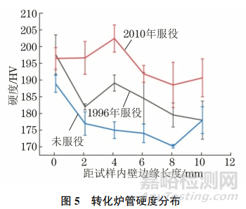 在爐管的壽命評(píng)估中,硬度為一項(xiàng)參考值。對(duì)不同服役時(shí)間離心轉(zhuǎn)化爐管的內(nèi)壁到外壁的橫截面進(jìn)行了顯微硬度分析,采用數(shù)顯顯微維氏硬度計(jì)進(jìn)行測(cè)試,載荷為4.9N,載荷保持時(shí)間為15s。測(cè)量3個(gè)試樣內(nèi)壁到外壁一條直線等間距6個(gè)點(diǎn)的顯微硬度,結(jié)果如圖5所示。由圖5可知:服役后轉(zhuǎn)化爐管試樣(2號(hào)和3號(hào)試樣)整體的顯微硬度較未服役轉(zhuǎn)化爐管試樣(1號(hào)試樣)高,且2號(hào)試樣的硬度比3號(hào)試樣高。同時(shí),爐管內(nèi)壁硬度較外壁硬度略高。由于轉(zhuǎn)化爐管在高溫下服役,二次碳化物在奧氏體基體中大量析出,細(xì)小的球狀或棒狀二次碳化物顆粒彌散在奧氏體基體中。由于彌散強(qiáng)化的作用,服役后的2,3號(hào)試樣的硬度比未服役的1號(hào)試樣硬度高,但3號(hào)試樣比2號(hào)試樣硬度低,這是因?yàn)榉蹠r(shí)間更長(zhǎng)的3號(hào)試樣析出的二次碳化物尺寸更大,彌散強(qiáng)化效應(yīng)減弱,因此硬度提高較少。爐管內(nèi)壁碳化物數(shù)量較外壁多,因此爐管內(nèi)壁顯微硬度高于外壁。