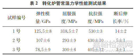 對(duì)1,2,3號(hào)試樣在室溫下進(jìn)行拉伸試驗(yàn),拉伸速率為0.05mm/s,測(cè)試結(jié)果如表2所示。未服役的1號(hào)試樣抗拉強(qiáng)度和彈性模量明顯高于長(zhǎng)期服役后的爐管,但是屈服強(qiáng)度與服役后的爐管相差不大。服役后試樣的斷后伸長(zhǎng)率也遠(yuǎn)低于未服役的1號(hào)試樣??梢钥闯鲭S著服役時(shí)間的延長(zhǎng),HP-Nb合金的抗拉強(qiáng)度、剛度均下降。轉(zhuǎn)化爐管在高溫服役后,HP-Nb合金的屈服強(qiáng)度和斷后伸長(zhǎng)率都明顯降低。服役后的轉(zhuǎn)化爐管一次碳化物粗化,由骨架狀轉(zhuǎn)變?yōu)榫W(wǎng)狀結(jié)構(gòu);大量二次碳化物在晶內(nèi)析出,并且隨著服役時(shí)間的延長(zhǎng),二次碳化物聚集長(zhǎng)大,這些導(dǎo)致了轉(zhuǎn)化爐管合金的屈服強(qiáng)度和塑性下降。