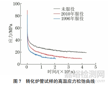(3)服役后的轉(zhuǎn)化爐管與未服役轉(zhuǎn)化爐管相比,室溫下服役后轉(zhuǎn)化爐管的力學(xué)性能降低較多,斷后伸長(zhǎng)率和抗拉強(qiáng)度都明顯降低,由于二次碳化物彌散析出,服役后轉(zhuǎn)化爐管的硬度增大。同時(shí)服役后的爐管高溫性能也有明顯降低,服役后爐管試樣蠕變斷裂時(shí)間均縮短,縮短時(shí)間超過(guò)未服役爐管蠕變斷裂時(shí)間的50%,且服役時(shí)間越長(zhǎng),蠕變斷裂時(shí)間越短,高溫應(yīng)力松弛試驗(yàn)中應(yīng)力減小達(dá)到穩(wěn)態(tài)的時(shí)間也縮短。