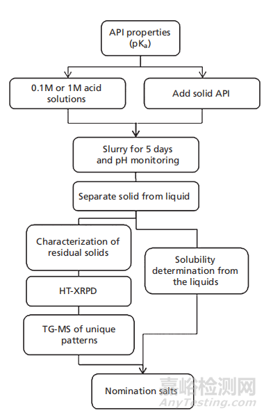 將2種原料藥分別加入對應(yīng)的酸溶液中,混合打漿5天。通過NMR、TGA和DSC等技術(shù)對所得的鹽型進行表征。詳細操作流程如下圖: