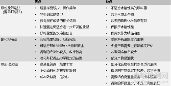 近年來,隨著高通量/自動化技術(shù)的發(fā)展,鹽型篩選技術(shù)也得以廣泛應(yīng)用。目前常用的三種方法,原位鹽篩選(混懸打漿法)、飽和溶液法和冷卻-蒸發(fā)法。不同方法各有利弊,先看結(jié)論。