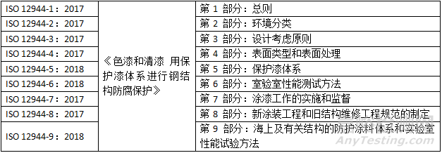 鋼結(jié)構(gòu)領(lǐng)域使用最廣泛的是ISO 12944標(biāo)準(zhǔn),從1998年第一版開始到2017/2018年最新版共包含9個(gè)部分[9],其中第5部分 “防護(hù)涂料體系”是使用最為廣泛的。ISO 12994加入了 ISO 20340《涂料和清漆 海上和相關(guān)結(jié)構(gòu)防護(hù)涂料系統(tǒng)的性能要求》,作為第9部分的內(nèi)容。在ISO 12944的基礎(chǔ)上,我國制訂了相應(yīng)的國家標(biāo)準(zhǔn)GB/T 30790—2014《色漆和清漆 防護(hù)涂料體系對鋼結(jié)構(gòu)的防腐蝕保護(hù)》、GB/T 31415-2015《色漆和清漆 海上建筑及相關(guān)結(jié)構(gòu)用 防護(hù)涂料體系性能要求》。