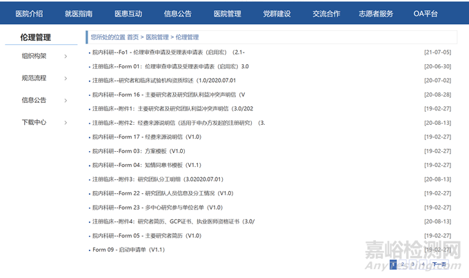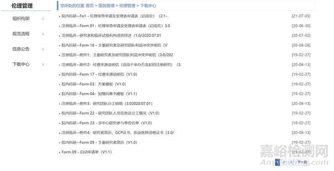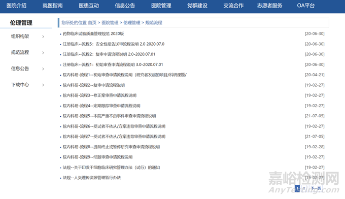 遞交文件準(zhǔn)備包括遞交文件的清單和遞交文件的模板填寫(xiě),如上文所訴,具體文件準(zhǔn)備以倫理委員會(huì)的要求為準(zhǔn),以仁濟(jì)醫(yī)院為例。首先登陸仁濟(jì)醫(yī)院官網(wǎng),點(diǎn)擊醫(yī)院管理下的倫理管理,進(jìn)入倫理管理頁(yè)面。