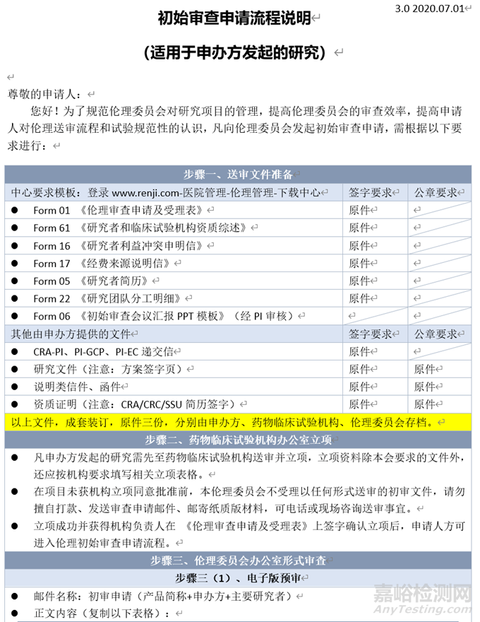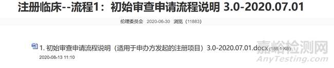 可以發(fā)現(xiàn),注冊(cè)臨床有初始審查流程、復(fù)審申請(qǐng)流程、安全性報(bào)告送審流程。點(diǎn)擊初審審查流程(復(fù)審?fù)恚瑸樯暾?qǐng)人提供的詳細(xì)說(shuō)明初始審查申請(qǐng)的word文件。