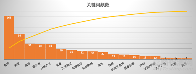 1. 可以看到雜質(zhì)出現(xiàn)次數(shù)遙遙領(lǐng)先,是唯一一個(gè)超過(guò)100次的關(guān)鍵詞,這也符合監(jiān)管方與申請(qǐng)人的預(yù)期,在新藥研究中,安全性是監(jiān)管方排在首位的關(guān)注點(diǎn)