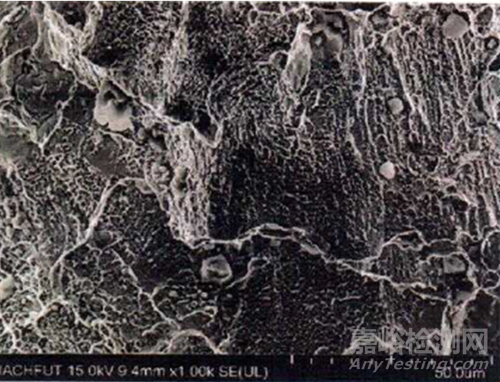 使暴露到特定環(huán)境中的試樣承受逐漸增加的應(yīng)變,通過特征參數(shù)評(píng)定應(yīng)力腐蝕開裂的敏感性分別在惰性環(huán)境和同一溫度的腐蝕性環(huán)境中以相同的應(yīng)變速率進(jìn)行試驗(yàn)。試驗(yàn)后首先將在惰性介質(zhì)中的各特征參數(shù)與在腐蝕介質(zhì)中的特征參數(shù)(斷面收縮率、最大載荷、內(nèi)積功等)進(jìn)行對(duì)比,得到應(yīng)力腐蝕敏感性指數(shù)ISCC來評(píng)定應(yīng)力腐蝕開裂敏感性。關(guān)于ISCC衡量應(yīng)力腐蝕開裂敏感性大小的一般評(píng)定:當(dāng)ISCC>35%,研究體系具有明顯的應(yīng)力腐蝕傾向;當(dāng)ISCC介于25%~35%之間,研究體系有應(yīng)力腐蝕傾向;當(dāng)ISCC<25%,研究體系沒有明顯的應(yīng)力腐蝕傾向。然后借助低倍顯微鏡進(jìn)行二次裂紋的宏觀觀察。最后借助掃描電鏡對(duì)試樣斷面進(jìn)行斷口形貌觀察,確定有無應(yīng)力腐蝕特征。SSRT試驗(yàn)?zāi)軌蚩焖僭u(píng)價(jià)特定金屬與環(huán)境組合的應(yīng)力腐蝕開裂敏感性,試驗(yàn)參數(shù)易于控制。