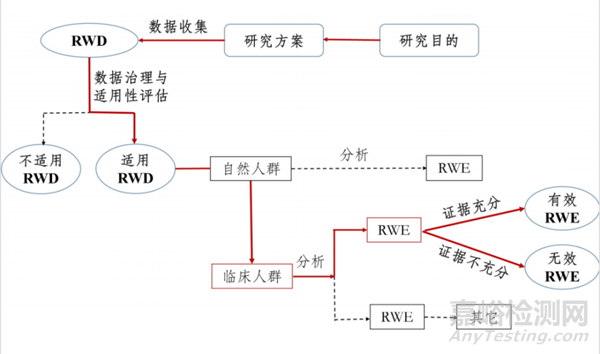 并非所有的臨床數(shù)據(jù)都可以作為臨床評價(jià)的證據(jù)。真實(shí)世界數(shù)據(jù)的產(chǎn)生源于對接醫(yī)院系統(tǒng)獲取到的原始數(shù)據(jù),經(jīng)過數(shù)據(jù)采集、數(shù)據(jù)鏈接、數(shù)據(jù)匯總、數(shù)據(jù)標(biāo)準(zhǔn)化,形成集成數(shù)據(jù)。集成數(shù)據(jù)基于一定研究目的識別研究人群、確定研究變量、數(shù)據(jù)治理、數(shù)據(jù)質(zhì)控,形成研究數(shù)據(jù)即專病庫。明確研究問題、流行病學(xué)設(shè)計(jì)、進(jìn)一步數(shù)據(jù)清理、統(tǒng)計(jì)分析形成具體研究。過上述數(shù)據(jù)處理過程,真實(shí)世界數(shù)據(jù)才能形成真實(shí)世界證據(jù)。