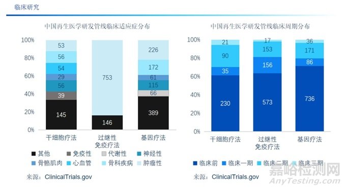 目前來看,盡管中國已經(jīng)批準了一些細胞和基因療法上市,但大多數(shù)的中國再生醫(yī)學(xué)研發(fā)管線進展主要集中在早期(以臨床一期為主),臨床二期和臨床三期相對較少。