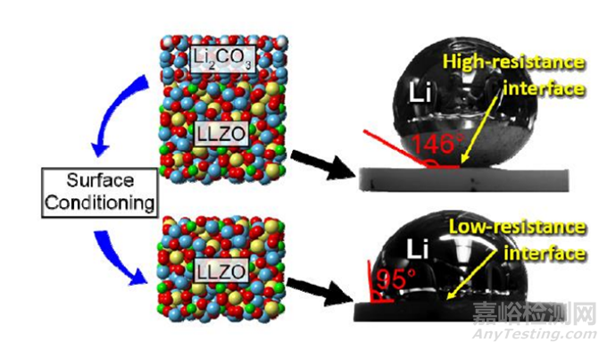 為了解決這一問題,對于不同的固態(tài)電解質(zhì)采用不同的方法。對于氧化物電解質(zhì)使用熔融鋰配合濕磨法或泡沫銅處理固-固界面問題。一般情況下經(jīng)過高溫?zé)Y(jié)之后的陶瓷片表面含有Li2CO3雜質(zhì)層,對熔融鋰的浸潤性較差。使用濕磨法將 Li2CO3雜質(zhì)打磨掉,露出純相Li7La3Zr2O12(LLZO)電解質(zhì)表面,用熔融鋰接觸角實驗來說明金屬鋰與LLZO陶瓷片的相容性,其熔融鋰接觸角由原來的140°減小到95°,明顯改善了對鋰的浸潤性。此外,氧化后的泡沫銅具有浸潤熔融鋰的性質(zhì),將一片特定形狀的泡沫銅氧化后置于陶瓷片上,熔融鋰會沿著泡沫銅的形狀浸潤整個泡沫銅孔道和泡沫銅與LLZO電解質(zhì)之間的界面,取下泡沫銅后熔融鋰依舊浸潤在陶瓷電解質(zhì)表面。