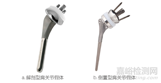 TSA 所使用的肩關(guān)節(jié)假體,其根據(jù)人體肩關(guān)節(jié)的形態(tài)、構(gòu)造及功能設(shè)計(jì),通過外科手術(shù)植入人體,代替病損的肩關(guān)節(jié),以緩解肩關(guān)節(jié)疼痛,通過其關(guān)節(jié)面的幾何形狀限制關(guān)節(jié)在一個(gè)或多個(gè)平面內(nèi)的平移和旋轉(zhuǎn)運(yùn)動(dòng),達(dá)到恢復(fù)肩關(guān)節(jié)功能的目的[2]。人工肩關(guān)節(jié)假體通常包括肱骨部件(如肱骨頭、肱骨柄、肱骨襯墊、肱骨托)、關(guān)節(jié)盂部件(如肩盂襯墊、肩盂托、肩盂頭、固定螺釘),按照產(chǎn)品結(jié)構(gòu)設(shè)計(jì)可分為解剖型肩關(guān)節(jié)假體、倒置型肩關(guān)節(jié),如圖1 所示,其通常由鈷鉻鉬合金、鈦合金、超高分子量聚乙烯、陶瓷材料制成。根據(jù)《醫(yī)療器械分類目錄》,該類產(chǎn)品為第Ⅲ類醫(yī)療器械,其分類編碼為13-04-03。