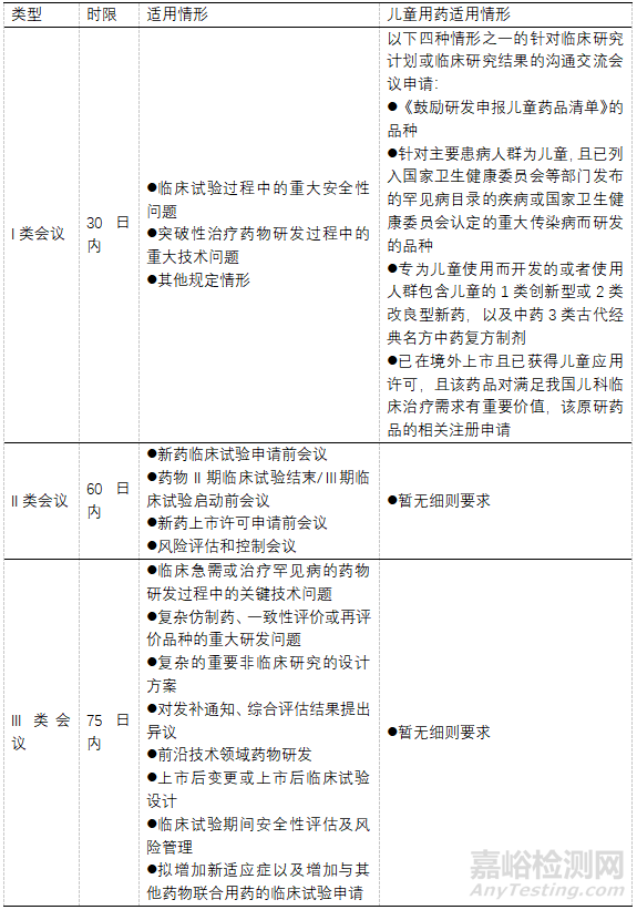 目前我國藥品審評溝通交流制度的實施主要參照2020年CDE發(fā)布的《藥物研發(fā)與技術(shù)審評溝通交流管理辦法》,申請人與審評團隊之間的溝通主要通過溝通交流會議進行,根據(jù)溝通交流的內(nèi)容,溝通交流會議主要分為I類會議、II類會議和III類會議。而2023年4月發(fā)布的《兒童用藥溝通交流中Ⅰ類會議申請及管理工作細則(試行)》在溝通交流制度的基礎上進一步細化了兒童用藥溝通交流中I類會議申請及管理的相關(guān)要求,對兒童用藥適用I類溝通交流會議的情形作了更細致的要求。這份文件的征求意見稿和正式稿的差距還是挺大的,原《兒童用藥溝通交流申請及管理工作程序(征求意見稿)》內(nèi)容上有點繞,但核心程序基本可以概括為II類會議申請調(diào)整為I類會議進行管理,而正式稿則直接調(diào)整為在原I類會議的適用范圍中的“其他情形”明確兒童用藥的適用情形。兒童用藥溝通交流會議工作時限及適用情形見表所示。