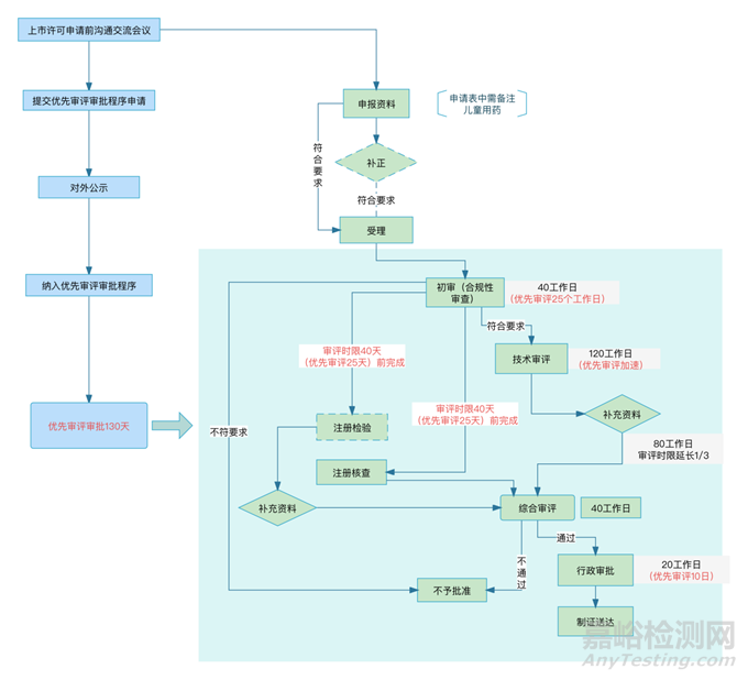 對于兒童用藥,我們需要在提出藥品上市許可申請前,申請II類溝通交流會議,探討產(chǎn)品是否符合兒童用藥優(yōu)先審評審批程序納入條件,以及現(xiàn)有臨床研究數(shù)據(jù)是否滿足藥品上市許可審查要求等。若CDE初步評估認為產(chǎn)品符合優(yōu)先審評審批納入條件的,申請人需要在會議紀要中明確,并填寫藥品上市許可優(yōu)先審評審批申請表,在CDE官方網(wǎng)站上的“優(yōu)先審評審批系統(tǒng)”中進行申請。CDE在受理后在5日內(nèi)對申請進行審核,并在CDE官方網(wǎng)站上對外公示擬納入優(yōu)先審評審批程序的產(chǎn)品,公示期為5日,若公示期間無異議,則納入優(yōu)先審評審批程序。對于納入優(yōu)先審評審批程序的藥品上市許可申請,審評時限將從常規(guī)的200日變?yōu)?30日。