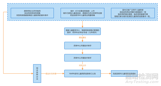 另一條路徑則是根據(jù)NMPA在2023年5月31號發(fā)布的《已上市藥品說明書增加兒童用藥信息工作程序(試行)》,對于符合條件的原研藥或者過評仿制藥,國家兒童醫(yī)學中心和民政部登記管理且具有兒童臨床職能的醫(yī)學藥學專業(yè)學會(協(xié)會)可以提出補充說明書中兒童用藥信息的建議。CDE在接收申請后,將對資料進行初審、品種遴選、提出修訂建議、專家審議,在通過專家審議后對外公示30天,并由NMPA發(fā)布無異議的《品種名單和說明書修訂建議表》。NMPA發(fā)布公告后,申請人可以根據(jù)公告信息,向CDE遞交修訂說明書的補充申請以增補說明書中的兒童用藥信息。