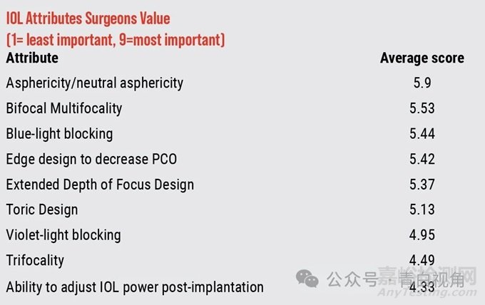 下圖為受訪眼科醫(yī)生眼中人工晶體性能的價(jià)值體現(xiàn)排名: