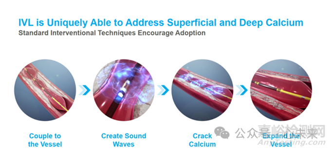冠狀動脈血管內(nèi)碎石術(shù)(IVL)是一種基于治療泌尿結(jié)石的碎石理念創(chuàng)新性研發(fā)的系統(tǒng),它在工作原理上區(qū)別于傳統(tǒng)的鈣化病變治療技術(shù),主要通過在球囊低壓擴(kuò)張時向病變提供未聚焦、圓周和脈沖式的機(jī)械能,以高效和安全地破壞淺表與深層鈣化,從鈣化病變內(nèi)部造成鈣化斑塊多發(fā)、微小的碎裂,使鈣化斑塊松散卻不影響血管內(nèi)膜的完整性,達(dá)到鈣化斑塊修飾的效果,擴(kuò)大管腔面積,改善血管順應(yīng)性,為后續(xù)的支架置入和展開提供充分的條件。