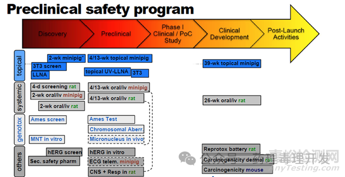 Novartis之前分享過局部用藥的臨床前安全性評價的研究計劃。IND之前以嚙齒類+非嚙齒類的局部、系統(tǒng)短期重復給藥、遺傳毒性、安全藥理等為主,臨床期間補充更長周期一般毒理研究、生殖毒及致癌性試驗。從藥物發(fā)現(xiàn)到IND enabling、支持更長周期臨床或上市的研究示意圖如下: