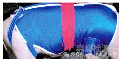下一步就是將藥物均勻的涂抹至給藥部位。之后,為了降低動物口部接觸的風險,并最大程度模擬臨床,通常會采用半封閉的透氣材料覆蓋,模擬臨床衣物接觸的情況。已有市售的動物T恤上市,比如下圖中的Lomir T-shirt。