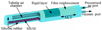 變剛度執(zhí)行器作為軟式機(jī)器人手套的關(guān)鍵組成部分,其結(jié)構(gòu)設(shè)計(jì)直接影響到設(shè)備的性能。本論文介紹了變剛度致動(dòng)器的設(shè)計(jì),包括變剛度執(zhí)行機(jī)構(gòu)的結(jié)構(gòu)圖、手指上的松散可變剛度室嵌入的纖維增強(qiáng)軟致動(dòng)器(MSAE),以及MSAE在真空壓力下提供高彈性的原理。