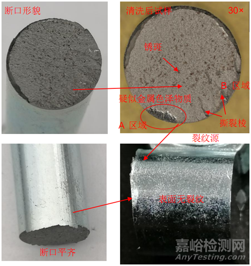 1.斷口試樣A及B區(qū)域有明顯的撕裂棱,A區(qū)域存在疑似金屬色澤物質(zhì),這些區(qū)域應(yīng)是裂紋源位置,斷面基本平齊,基本無(wú)變形;