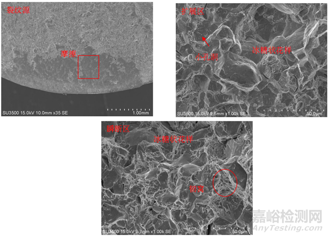 2.擴(kuò)展區(qū)整體呈現(xiàn)冰糖狀花樣,局部區(qū)域有小孔洞,是典型的沿晶脆性斷裂特征;