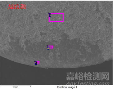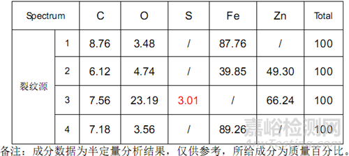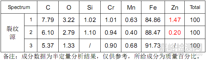 1.裂紋源位置存在明顯的摩擦痕跡,其成分中含有一些Zn元素,可能是此區(qū)域在鍍鋅之前存在裂紋,鍍鋅過(guò)程中有Zn元素進(jìn)入基材;