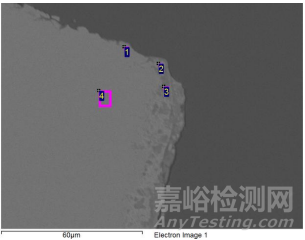 對(duì)斷口表面進(jìn)行SEM+EDS分析,結(jié)果如圖3~4及表1所示: