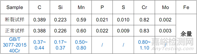 斷裂試樣與正常試樣化學(xué)成分符合40Cr規(guī)格,符合客戶(hù)要求規(guī)格。