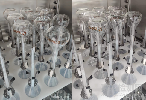在測試的過程中我們以200ml容量瓶為例,如若采用自然晾干的方式進行干燥則需要12h以上才能完全干燥,若是采用傳統(tǒng)烘箱或是我司產(chǎn)品器皿干燥保存柜進行烘干其平均時間也在4小時以上,同時我們也發(fā)現(xiàn)使用烘箱烘干時若室溫與烘箱內(nèi)溫度差較大;其內(nèi)部干燥后拿出烘箱在30s內(nèi)其內(nèi)部水蒸氣又會重新凝結(jié);通過研究我司發(fā)現(xiàn)出現(xiàn)此類現(xiàn)象的原因在于,烘箱靠長時間的高溫將容量瓶內(nèi)部水分進行蒸發(fā),但由于容量瓶特殊的器型導(dǎo)致水蒸氣聚集在瓶內(nèi)難以排出;故當內(nèi)外溫差較大時,水蒸氣遇冷又迅速凝結(jié)于內(nèi)壁(以下稱為“返濕”現(xiàn)象)。使其干燥效率大打折扣。