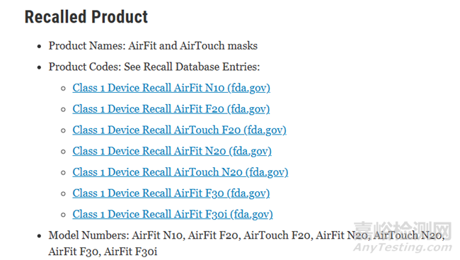 瑞思邁AirFit 和 AirTouch一級召回