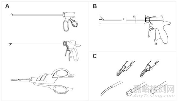 ▲ 圖2A 超聲刀頭各類手柄示意圖,夾鉗式(上)、握式(中)、剪式(下); 圖2B 超聲刀桿長度(L)多為23cm、36cm、45cm;圖2C 超聲刀頭尖端形態(tài)結(jié)構(gòu)示意圖,多用剪(上左)、彎型多用剪(上右)、彎型剝離刀(下左)、分離鉤(下中)、止血球(下右)
