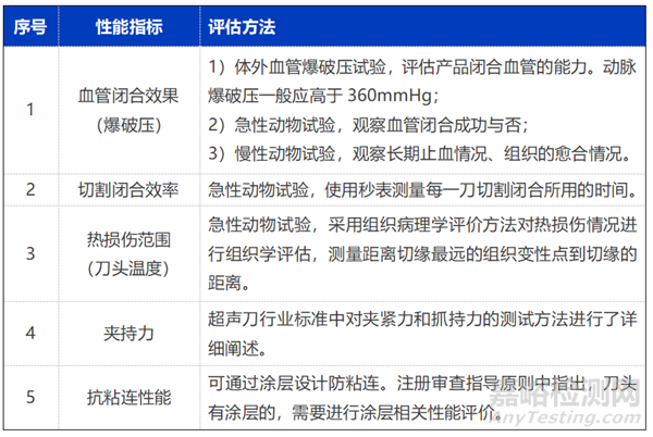臨床對于超聲刀主要關(guān)注的性能指標(biāo)包括:血管閉合效果、切割閉合效率、熱損傷范圍、精細(xì)切割分離、夾持力、防粘連等,其中最重要的是切割效率和血管閉合效果。指導(dǎo)原則及行業(yè)標(biāo)準(zhǔn)也對這些指標(biāo)提出了相應(yīng)的評估方法。