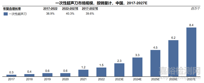 ▲ 表8 中國一次性超聲刀市場規(guī)模(2017-2027E,按銷量計)