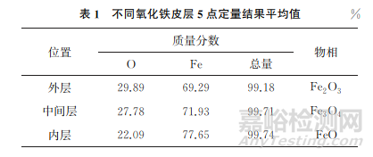 對氧化鐵皮層不同襯度圖像的外層、中間層和內(nèi)層3個區(qū)域各選擇5點(diǎn)進(jìn)行元素的定量測試,表面氧化鐵皮的不同襯度位置如圖1所示,不同氧化鐵皮層5點(diǎn)定量結(jié)果平均值如表1所示。