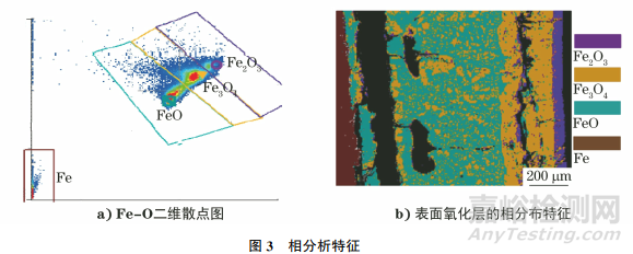 結(jié)合點(diǎn)定量測試和面分析測試結(jié)果,借助相分析的軟件功能,可以把Fe元素和O元素展開,用二維散點(diǎn)圖表示,在該基礎(chǔ)上勾勒不同含量的散點(diǎn),可以在面分析結(jié)果上把物相標(biāo)注出來(見圖3)。圖3a)為Fe-O二維散點(diǎn)圖,根據(jù)散點(diǎn)分布特征,可以得到4種點(diǎn)簇,分別為Fe2O3、Fe3O4、FeO 和Fe。在面分析結(jié)果的外層、中間層、內(nèi)層和基體4個位置標(biāo)注,可以看出自表層開始依次形成Fe2O3、Fe3O4和FeO,內(nèi)層的FeO中混有Fe3O4相。