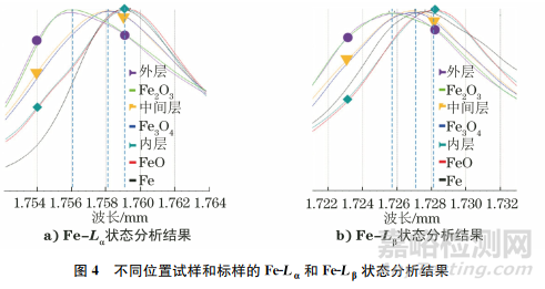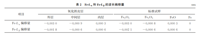 分別以純Fe的Lα和Lβ峰位為基準(zhǔn)點(diǎn),比較不同氧元素含量的標(biāo)樣和氧化鐵皮層的峰位偏移情況,其偏移量如表2所示。結(jié)合Lα和Lβ具體的偏移結(jié)果可以看出,外層氧化鐵皮的偏移量符合物相Fe2O3的偏移量,判斷外層 的氧化鐵皮物相以Fe2O3的形式存在。依此類推,中間層為Fe3O4,靠近基體的內(nèi)層為FeO。
