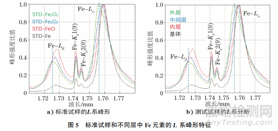 使用相同的測試條件和狀態(tài)分析測試方法,分別測試不同標(biāo)樣和氧化鐵皮各層中元素Fe的L線系,對比其峰形特征,結(jié)果如圖5所示,計算Lβ強(qiáng)度與Lα強(qiáng)度的百分比,結(jié)果如表3所示。