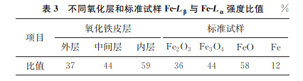 結(jié)果顯示,不同氧化鐵皮層中物相與對應(yīng)標(biāo)準(zhǔn)試樣中的Lβ/Lα比值符合,可以確認(rèn)從外層至基體的氧化鐵皮層物相對應(yīng)為外層Fe2O3、中 間 層Fe3O4和內(nèi)層FeO。