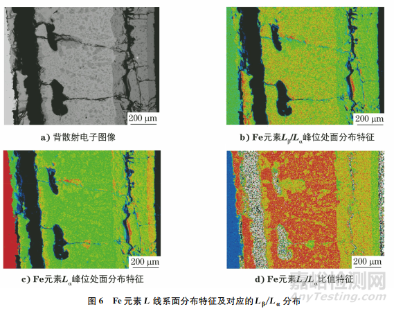 由圖6可知:雖然L線系的靈敏度不如主峰Kα,但在Fe元素Lβ和Lα的面分布圖像上,根據(jù)顏色變化和對應(yīng)的色彩條上的值,也能夠得到氧化鐵皮多層的分布特征;氧化鐵皮各層物相L線系比值和表3符合。