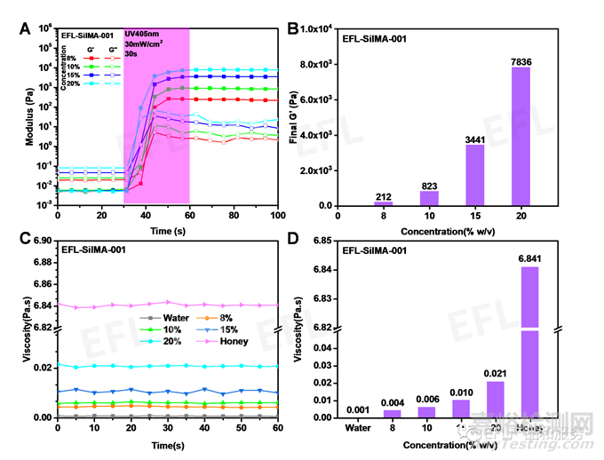圖1 EFL-SilMA-001不同濃度流變學(xué)特性:(A)光固化過(guò)程;(B)固化后儲(chǔ)能模量;(C,D)黏度,純水及蜂蜜作參考