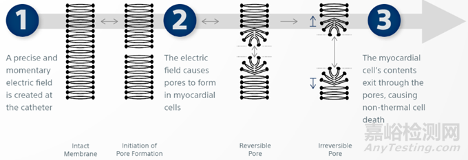 脈沖場消融的作用機制是不可逆電穿孔 (IRE)。與通過局部組織溫度導(dǎo)致細(xì)胞死亡的熱消融不同,脈沖場消融在組織細(xì)胞的特定電閾值之上施加超快速電脈沖,使細(xì)胞膜不穩(wěn)定并形成納米級孔,導(dǎo)致細(xì)胞內(nèi)容物排出,導(dǎo)致細(xì)胞死亡。