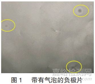 生產(chǎn)中發(fā)現(xiàn),涂布時涂層表面會出現(xiàn)大小不一的圓形異常區(qū)域,經(jīng)過輥壓機輥壓后,圖1中涂覆區(qū)表面出現(xiàn)的圓形顏色異常區(qū)域即為氣泡,圓形區(qū)內(nèi)部顏色較深,說明此處碳層偏薄,輕度凹陷導致未輥壓到;圓形區(qū)邊緣出現(xiàn)亮色邊線,是因為此處偏厚,壓實密度較大。