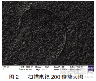 從生產(chǎn)現(xiàn)場選取帶有氣泡的負極片,取樣后使用掃描電鏡放大200倍觀察,發(fā)現(xiàn)氣泡處有異物,呈纖維狀或者片狀,如圖2所示,說明此類極片在涂布時涂布液內(nèi)混入了雜質(zhì),此類雜質(zhì)是由于生產(chǎn)過程中環(huán)境潔凈度不合格導致。