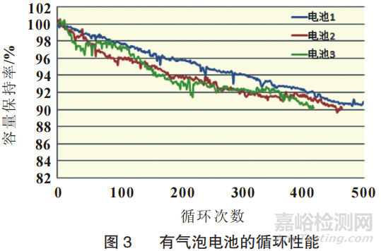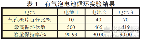 將氣泡極片制成3只電池,在常溫下進行500次循環(huán)性能實驗,當電池容量保持率低于90%時實驗自動終止。3只電池使用的負極氣泡極片比例占電池總負極片的比例分別為10%、40%、70%,電池的循環(huán)結果見圖3,實驗結果見表1。